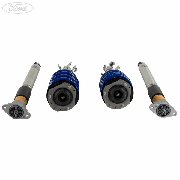 Stainless steel dampers with individual adjustable bump- and rebound settings. Powder coated springs in Ford Performance Blue. Complete pre-assembled and pre-adjusted kit. Enables adjustable lowering