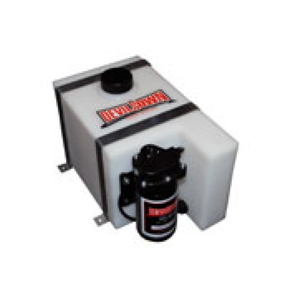 This 2.25 Gallon tank from Devilsown is the first water-methanol tank with a built in sump and fluid control baffle. This eliminates the pickup being uncovered during sprinted driving. Because of the tanks quality design and it featuring a real sump in it, you can run the tank down to approximately 1 qt of fluid before uncovering the pickup. This tank is made with 1/4" thick HDPE, which is the same material and construction that is commonly used in manufacturing fuel cells.